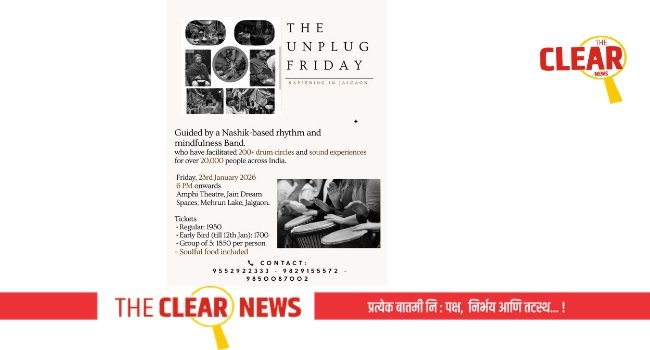 जळगाव, दि. प्रतिनिधी — धकाधकीच्या दैनंदिन जीवनातून थोडा विराम घेण्यासाठी जळगावात ‘अनप्लग फ्रायडे’ हा अनोखा आणि अनुभवसमृद्ध कार्यक्रम आयोजित करण्यात आला आहे. येत्या शुक्रवार, 23 जानेवारी 2026 रोजी सायंकाळी 6 वाजल्यापासून मेहरूण तलाव परिसरातील जैन ड्रीम स्पेसेस येथील अॅम्फी थिएटरमध्ये हा उपक्रम पार पडणार आहे.