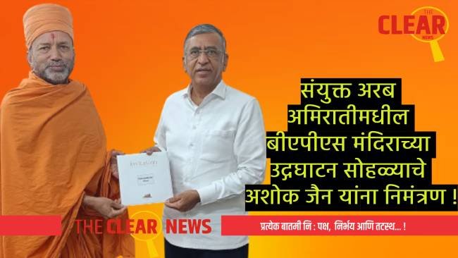 जळगाव (प्रतिनिधी) संयुक्त अरब अमिराती (UAE) मधील अबूधाबी येथे भव्य बीएपीएस हिंदू मंदिराचे (BAPS Temple) उद्घाटन परमपूज्य महंत स्वामीजी महाराज आणि पंतप्रधान नरेंद्रजी मोदी यांच्या हस्ते आज दि. १४ फेब्रुवारीला होत आहे. या ऐतिहासिक सोहळ्याचे निमंत्रण जैन इरिगेशन सिस्टीम्स लि.चे अध्यक्ष अशोक जैन यांना प्राप्त झाले आहे. धुळे येथील स्वामी नारायण मंदिराचे प्रमुख आनंद स्वामीजी महाराज यांनी हे निमंत्रण अशोक जैन यांना प्रत्यक्ष येऊन सन्मानपुर्वक दिले. या निमंत्रणाचा स्वीकार करून श्री. अशोक जैन हे या मंदिराच्या लोकार्पण सोहळ्यास उपस्थितीत राहणार आहेत.