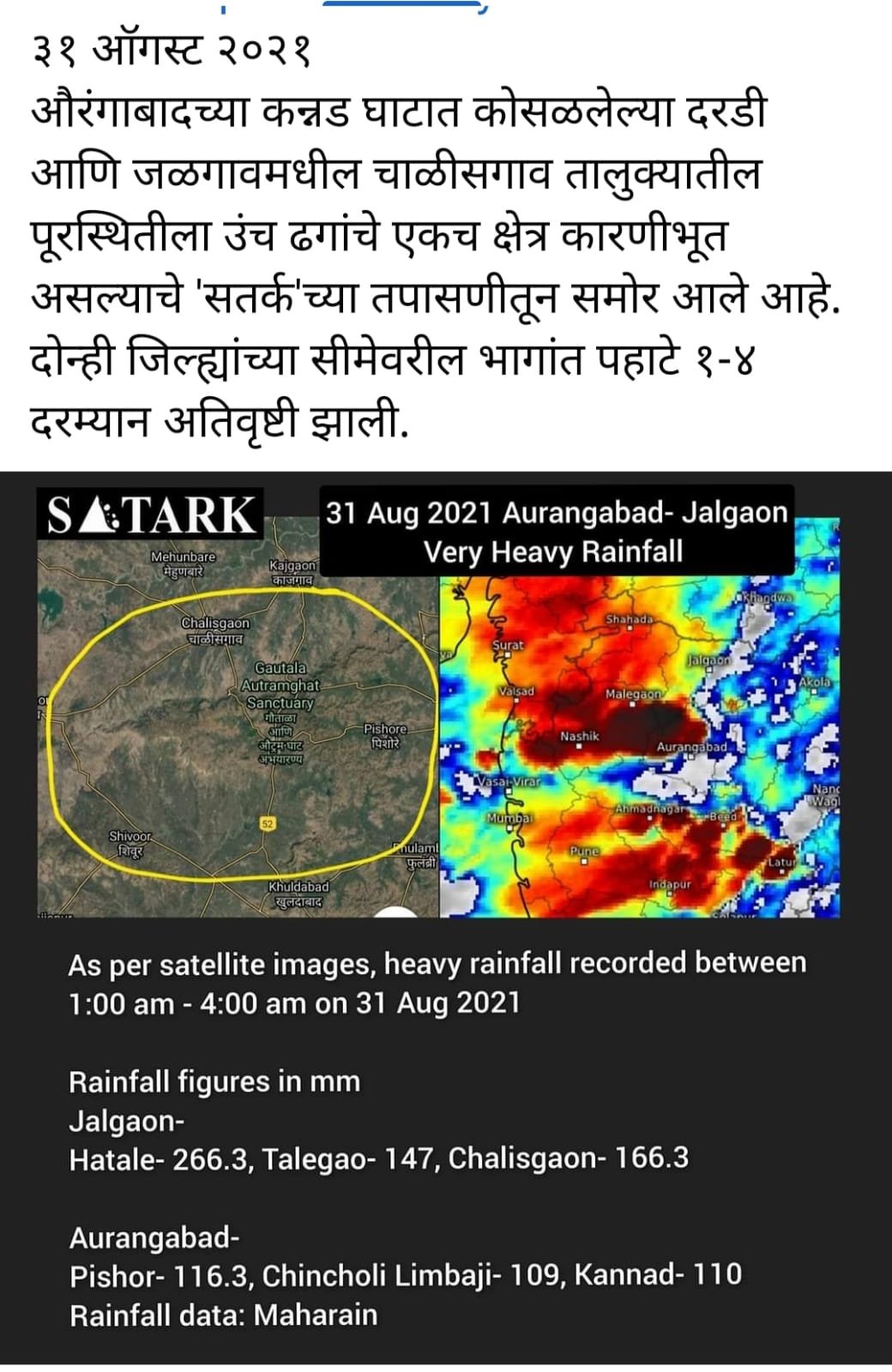 • ‘सतर्क’च्या तपासणीतून 31 ऑगस्ट 2021 रोजी औरंगाबादच्या कन्नड घाटात कोसळलेल्या दरडी आणि जळगावमधील चाळीसगाव तालुक्यातील पूरस्थितीला उंच ढगांचे एकच क्षेत्र कारणीभूत असल्याचे समोर आले आहे. दोन्ही जिल्ह्यांच्या सीमेवरील भागांत पहाटे 1 ते 4 दरम्यान अतिवृष्टी झाली. ही अतिवृष्टी आहे, ढगफुटी नाही!