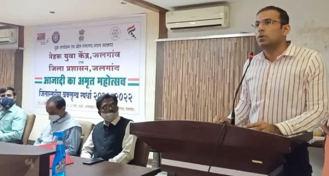 जिल्हा प्रशासन आणि भारत सरकारच्या युवा कार्यक्रम आणि खेळ मंत्रालय संचालित नेहरू युवा केंद्र जळगावच्या माध्यमातून तालुकास्तरावर ‘आजादी का अमृत महोत्सव’ अंतर्गत प्रत्येक तालुक्यात गेल्या आठवड्यात वक्तृत्व स्पर्धेचे आयोजन करण्यात आले होते. स्पर्धेची जिल्हास्तरीय फेरी जिल्हाधिकारी अभिजीत राऊत यांच्या मार्गदर्शनाखाली मंगळवारी अल्पबचत भवनात पार पडली. सकाळी मान्यवरांच्या उपस्थितीत दीपप्रज्वलन करून स्पर्धेला सुरुवात करण्यात आली. प्रसंगी जिल्हा परिषदेचे मुख्य कार्यकारी अधिकारी डॉ.पंकज आशिया, उपजिल्हाधिकारी प्रसाद मते, कवयित्री बहिणाबाई चौधरी विद्यापीठाचे डॉ.उमेश गोगडीया, भुसावळ रेल्वे विद्यालयाचे प्राचार्य एस.व्ही.कुलकर्णी, केसीईचे प्रा.संदीप केदार, जेष्ठ नाट्यकर्मी विनोद ढगे, नेहरू युवा केंद्राचे युवा अधिकारी नरेंद्र डागर, लेखापाल अजिंक्य गवळी, माजी युवा स्वयंसेवक चेतन वाणी आदी उपस्थित होते.