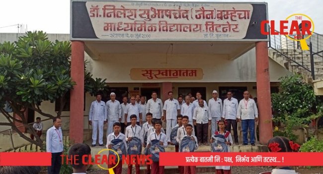 जळगाव (प्रतिनिधी) जळगाव तालुक्यातील विटनेर येथील डॉ. निलेश सुभाषचंद्र (जैन) ब्रम्हेचा महाविद्यालयातील विद्यार्थ्यांना स्वतंत्र दिनाच्या निमत्ताने स्वच्छता व पाणीपुरवठा मंत्री तथा पालकमंत्री गुलाबराव पाटील आणि जीपीएस फाउंडेशनतर्फे दप्तर वाटप करण्यात आले.
