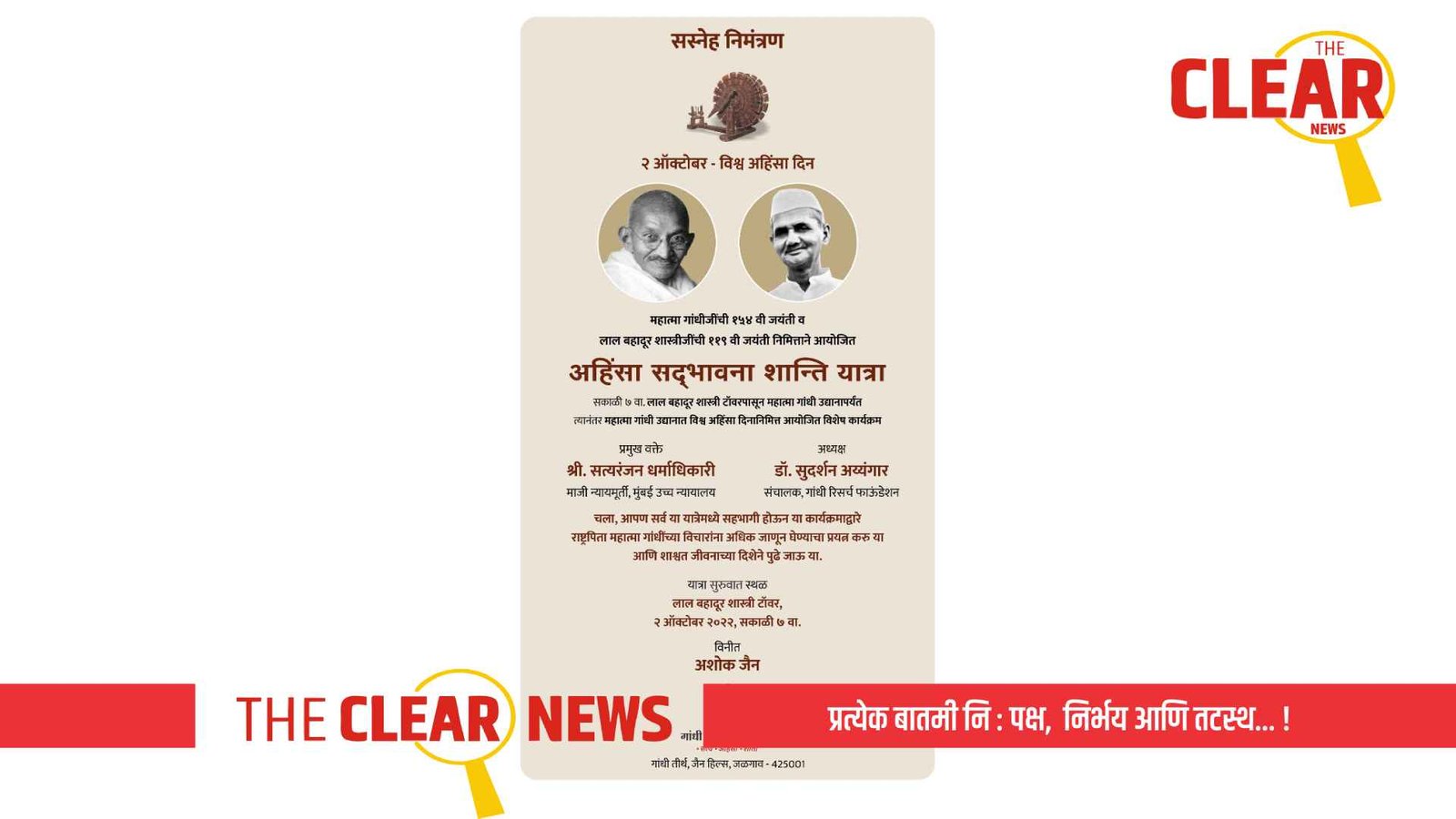 जळगाव (प्रतिनिधी) : महात्मा गांधी यांच्या जन्म दिवस ‘विश्व अहिंसा दिन’ म्हणून जगभर साजरा करण्यात येतो. या औचित्याने गांधी रिसर्च फाऊंडेशनच्यावतीने सालाबादाप्रमाणे ‘अहिंसा सद्भावना शांती यात्रेचे’ आयोजन करण्यात आले आहे.