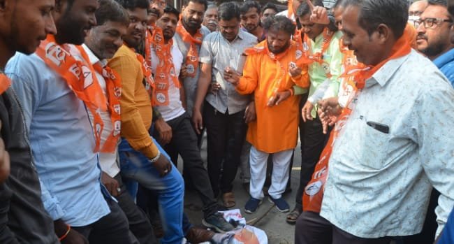 पाळधी ता. धरणगाव (प्रतिनिधी) पालकमंत्री ना. गुलाबराव पाटील यांच्या कव्वाली गायनावर अतिशय खालच्या स्तरावरून टीका करत भाजप नेते निलेश राणे यांनी कव्वालीसह पालकमंत्र्यांचा अपमान केल्याबद्दल येथील मुस्लीम समुदायातून अतिशय तीव्र प्रतिक्रिया उमटली आहे. आज शहरातून मोर्चा काढून राणेंच्या प्रतिमेला चपला – जोड्यांचा मार देऊन त्यांचा निषेध करण्यात आला. याप्रसंगी जोरदार घोषणबाजीने परिसर दणाणून निघाला होता.