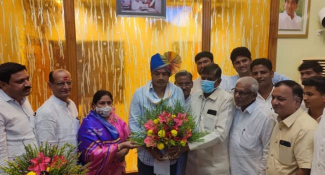 त्याअगोदर कृषिभूषण साहेबराव पाटील यांच्या राजभवन येथे आमदार रोहित पवार यांना फेटा बांधून स्वागत करतांना जिजामाता कृषिभूषण पुष्पलता साहेबराव पाटील, कृषिभूषण साहेबराव पाटील, राष्ट्रवादी काँग्रेस पार्टीचे जिल्हाध्यक्ष रविंद्रभैया पाटील, माजी नगराध्यक्ष विनोद पाटील, श्याम पाटील, रवि बापू, मनोराज पाटील, विक्रांत पाटील, नरेंद्र संदानशिव आदी उपस्थित होते.