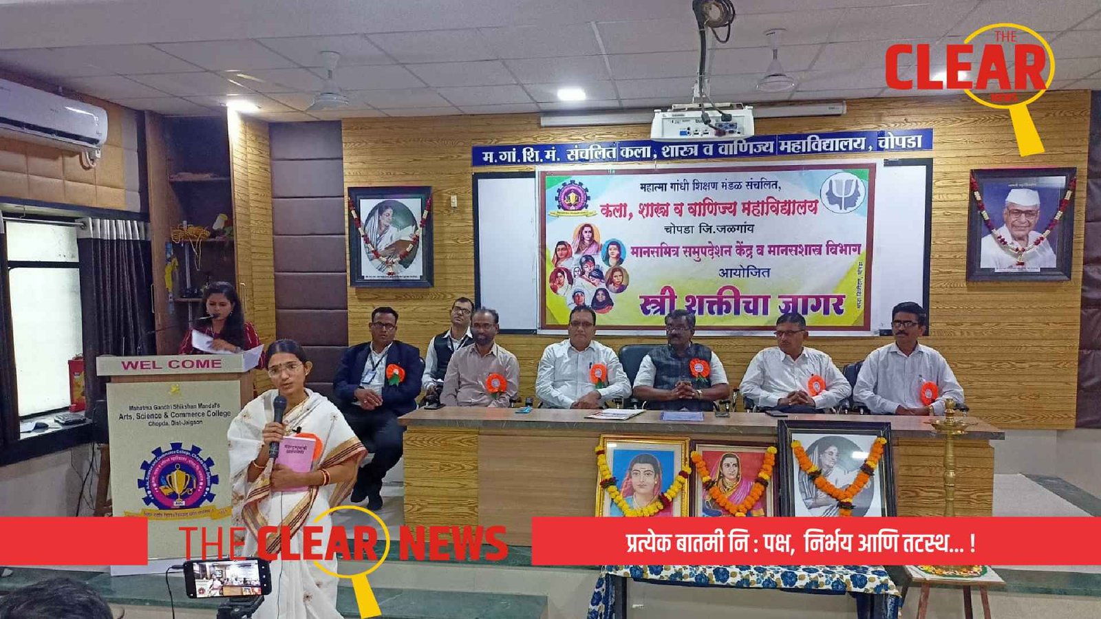 चोपडा(प्रतिनिधी) येथील महात्मा गांधी शिक्षण मंडळ संचलित, कला, शास्त्र व वाणिज्य महाविद्यालयातील मानसमित्र समुपदेशन केंद्र व मानसशास्त्र विभाग यांच्यातर्फे ‘स्त्री शक्तीचा जागर’ कार्यक्रमाचे आयोजन करण्यात आले होते. यावेळी मा. उपप्राचार्य श्री.एन.एस.कोल्हे यांच्या हस्ते राजमाता जिजाऊ, सावित्रीबाई फुले व कै.मा.ना.अक्कासो.सौ. शरच्चंद्रिका सुरेश पाटील (माजी शिक्षणमंत्री, महाराष्ट्र राज्य) यांच्या प्रतिमेला माल्यार्पण करून तसेच दीपप्रज्वलन करून या कार्यक्रमाचे उदघाटन करण्यात आले. या कार्यक्रमाच्या अध्यक्षस्थानी महाविद्यालयाचे प्राचार्य डॉ.डी.ए.सूर्यवंशी उपस्थित होते. कार्यक्रमाच्या सुरुवातीला कल्याणी पाटील व अंजली धीवर या विद्यार्थिनींनी सुरेल स्वागत गीत सादर केले.