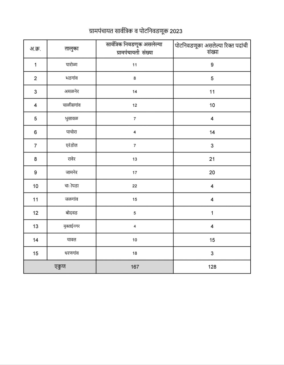 जळगाव (प्रतिनिधी) राज्य निवडणूक आयुक्त यू.पी. एस. मदान यांनी राज्यातील ग्रामपंचायत निवडणुकांबाबत घोषणा केली आहे. त्यानुसार राज्यातील सुमारे २३५९ ग्रामपंचायतींच्या सार्वत्रिक निवडणुका होणार आहेत. तसेच २०६८ ग्रामपंचायतीमधील २९५० सदस्य पदाच्या तर १३० सरपंचांच्या रिक्तपदांच्या पोटनिवडणुकाही होणार आहेत. जळगाव जिल्ह्यात १६७ ग्रामपंचायतींच्या सार्वत्रिक निवडणुका तर ८१ ग्रामपंचायतीच्या पोटनिवडणुकीत १२८ रिक्त पदांसाठी निवडणूका होणार आहेत. ५ नोव्हेंबर २०२३ रोजी या निवडणुकांसाठी मतदान होणार आहे.