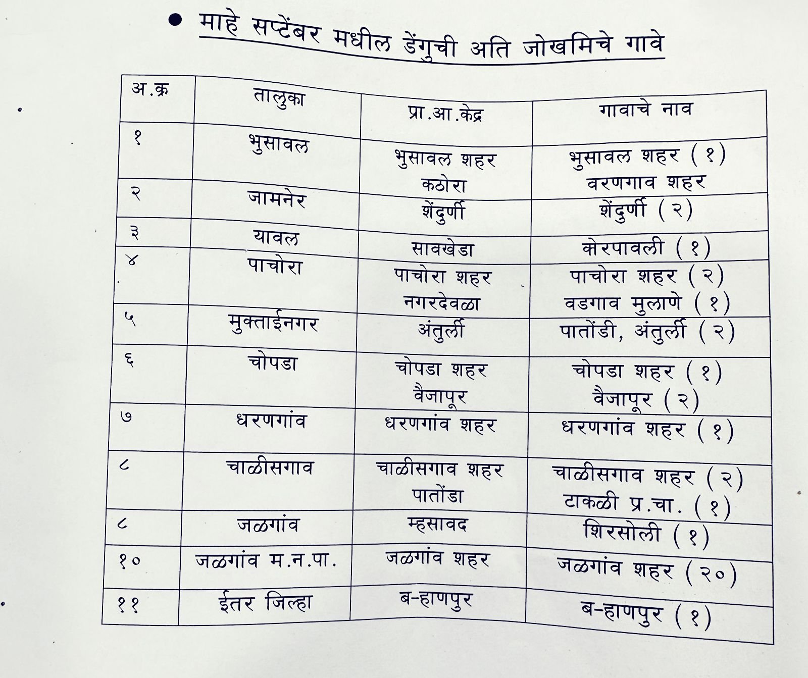 डेंग्यू बाधित रुग्ण संख्येबाबत पालकमंत्री गुलाबराव पाटील यांनी चिंता व्यक्त केली आहे. आरोग्य यंत्रणेने नियोजन करून डेंग्यूचे रुग्ण कमी करण्याचे निर्देश ग्रामविकास मंत्री गिरिष महाजन यांनी दिले आहेत. डेंग्यूमुळे बाधीत रुग्णांच्या उपचाराकडे लक्ष देण्याच्या सूचना आपत्ती व्यवस्थापन मंत्री अनिल पाटील यांनी दिल्या आहेत. असे नमूद करून जिल्हाधिकारी आयुष प्रसाद म्हणाले की, घराच्या परिसरातपाणी साचू देऊ नका, डबक्याच्या स्वरुपात जमा झालेले पाणी प्रवाहीत करावे, अथवा त्यावर माती टाकून खड्डे बुजविण्यात यावेत, ही कार्यवाही ग्रामपंचायत, नगरपालिका , महानगरपालिकाद्वारे करण्यात यावी. कायमस्वरुपी पाण्याचा स्त्रोत असलेली ठिकाणे परंतू जिथे स्वच्छ पाणी साचून आहे. अशी ठिकाणे उदा. नदी, नाले, तलाव, विहीरी यात प्राथमिक आरोग्य केंद्राद्वारे गप्पी मासे सोडण्यात यावीत.