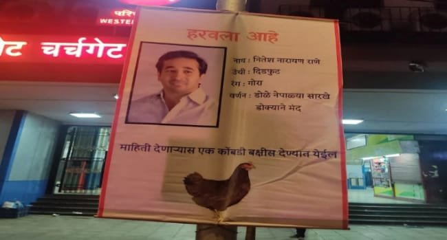 मुंबईतील चर्चगेट या स्थानकाबाहेर नितेश राणे यांच्या फोटोसह एक बॅनर लावण्यात आला आहे. तसंच यात नितेश राणे हरवले असल्याचं म्हटलं आहे. त्यांच्याबद्दल माहिती देणाऱ्यास एक कोंबडी बक्षीस म्हणून देण्यात येईल, असंही बॅनरवर नमूद करण्यात आलंय. दरम्यान, हे बॅनर कोणी लावले याबद्दल मात्र कोणतीही माहिती समोर आलेली नाही.
