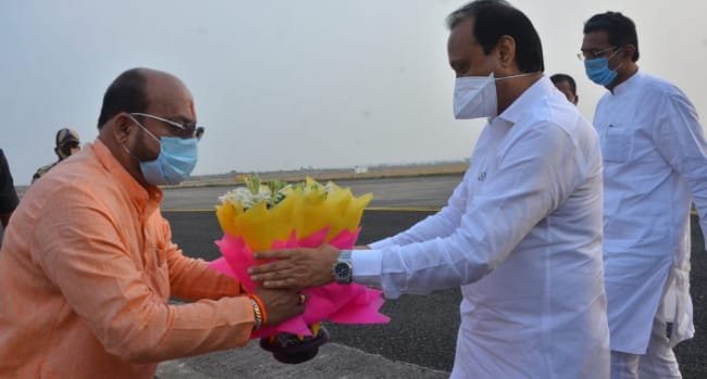 जळगाव (प्रतिनिधी) राज्याचे उपमुख्यमंत्री अजित पवार यांचे आज सकाळी जळगाव विमानतळ येथे आगमन झाले. यावेळी पालकमंत्री ना. गुलाबराव पाटील यांनी पुष्पगुच्छ देऊन त्यांचे स्वागत केले.
