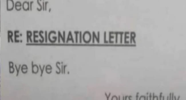 हे तीन शब्द कोणते? तर ते असे आहेत ‘Bye Bye Sir'(बाय बाय सर) असे हे तीन मॅजिकल शब्द आता लोकांना खळखळून हसवत आहेत. तीन शब्दांचा हा राजीनामा कदाचित जगातला सर्वात लहान आणि कमी शब्दांचा राजीनामा असावा. Maphanga Mbuso नावाच्या ट्वीटर युजरने हा 3 शब्दांचा राजीनामा दिला आहे. या तीन शब्दांच्या राजीनाम्याचा स्क्रीनशॉट त्याने ट्विटरवर शेयर केला आहे. याला त्याने कॅप्शनही अगदी ‘Simple’या एका शब्दाचं कॅप्शन दिलं आहे. त्याच्या या ट्विटला २ लाखांपेक्षा जास्त लाईक्स आले आहेत. ५० हजारांपेक्षा जास्त लोकांनी यावर भन्नाट कमेंट्स केल्या आहेत तर ५ हजारांहून अधिक लोकांनी याला रिट्वीट केलं आहे. तीन शब्दांचा राजीनामा वाचून लोकांना हसू आवरत नाहीये.